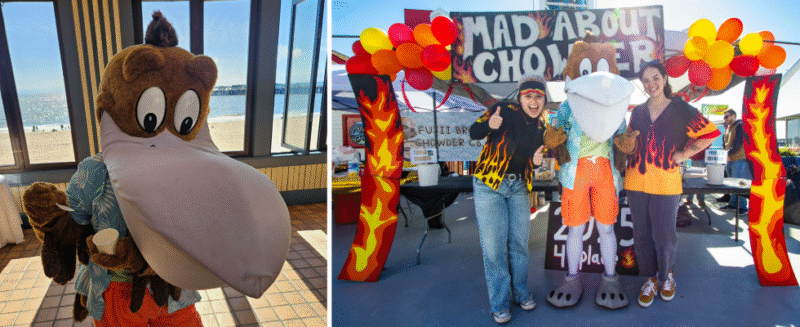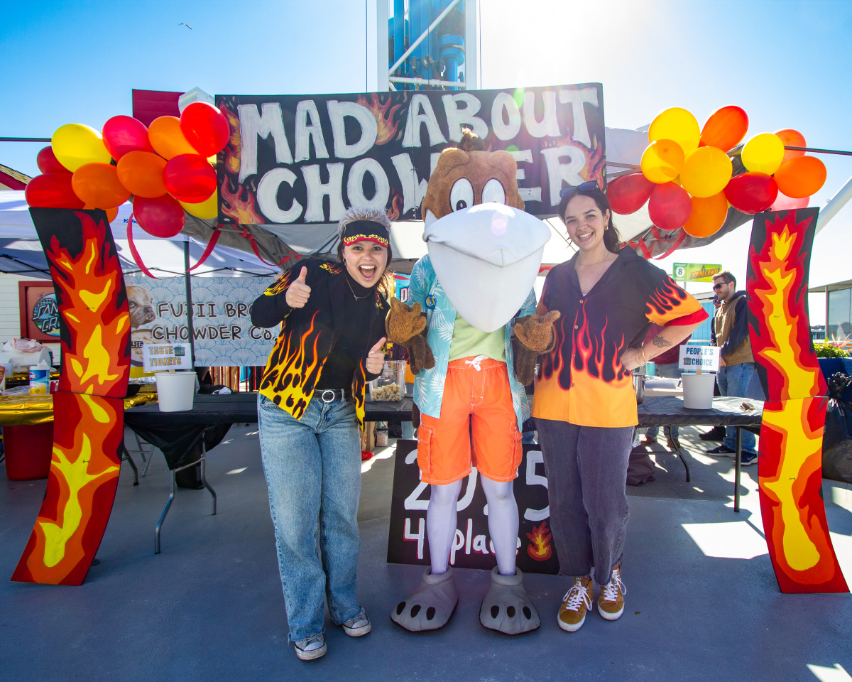 This past weekend, decked out in the official Clam Chowder t-shirt, Splash attended the beloved event to accomplish his goal of becoming a true Chowder Connoisseur. Despite the rainy weather earlier in the week, the weekend turned out cool and sunny—perfect conditions for Splash to swoop in—literally—to join the fun, meet the chefs, and taste-test some of Santa Cruz’s most creative and comforting chowders. Spoiler: it was delicious!
